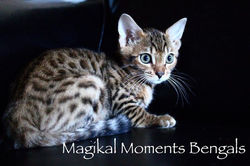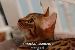 When trying to think of a Magikal Moment to name this little fireball after, an image of the mist rising off a lake with a campfire in foreground came to mind.....hence a Mystikal Fire! And she definitely has the hot and cold personality going on! Mystik can be a sweet loving girl one minute and then a cold, busy, independent cat the next. She loves playing fetch with her pom-pom balls (especially at 2 in the morning!) and we literally mean fetch. She brings the ball right back when we throw it! She also goes absolutely crazy for 'da Bird'! Mystik enjoys sleeping on top of cat scratching posts and in cat hammocks!